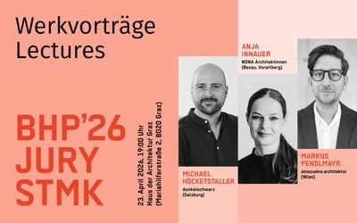 Am Donnerstag dem 23. April gibt es die Gelegenheit die steirischen Nominierungsjuror:innen für den BHP'26 kennenzulernen und mehr über ihre Arbeit zu erfahren. Anja Innauer nona architekt:innen, Bezau; Markus Pendlmayr einszueins Architektur, Wien und Michael Höcketstaller dunkelschwarz ZT GmbH, Salzburg stellen sich vor.
