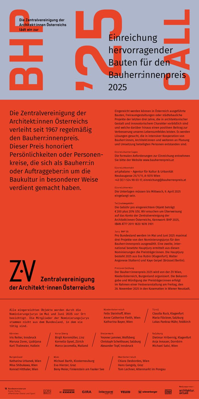 weiterlesen …Auch in diesem Jahr sucht die Zentralvereinigung der Architekt:innen Österreichs wieder beispielhafte Bauprojekte in Österreich für den Bauherr:innenpreis 2025.