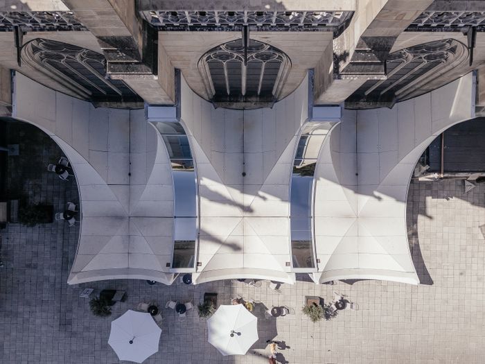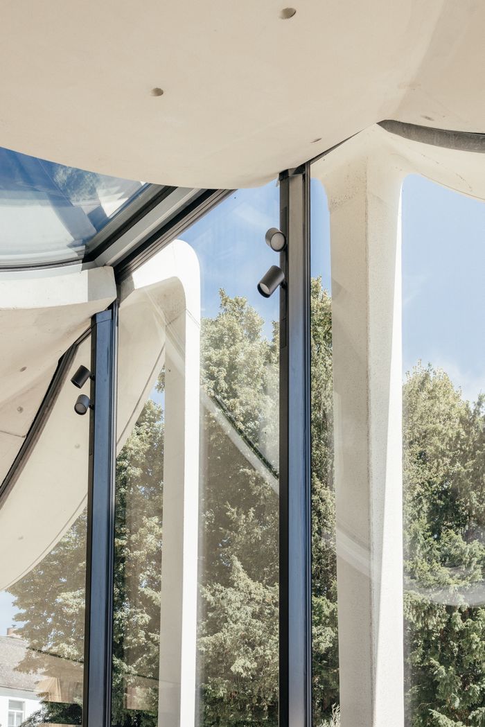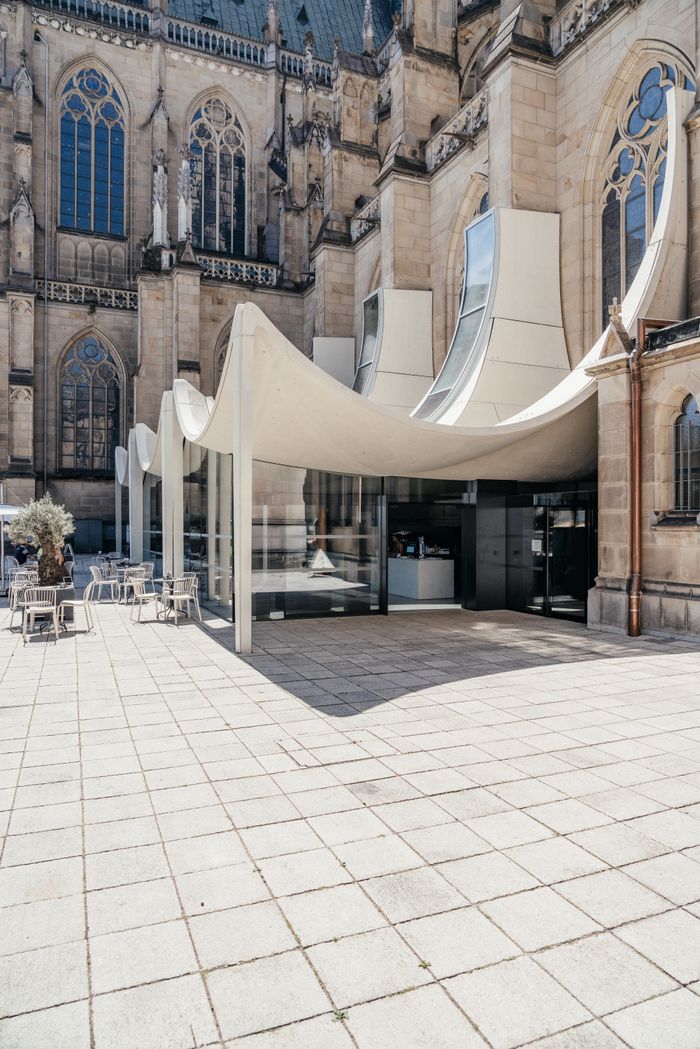 Ein erster Workshop mit Studierenden von Peter Haimerl, der damals an der Kunstuniversität Linz lehrte, sondierte mögliche Ansätze. Danach begann Haimerl, zusammen mit dem für die Innenarchitektur verantwortlichen Clemens Bauder, die konkrete Planung. Haimerl ist bekannt für seine Arbeiten im Bestand – und doch brauchte es mehrere Entwicklungsschritte, bis die Architekt:innen, begleitet von der oberösterreichischen Landeskonservatorin Petra Weiss, eine überzeugende Lösung fanden: Ein Pavillon aus leichten, baldachinartigen Sichtbetongewölben, die von Ferne wie ein Zelt erscheinen, das sich an den Dom lehnt. Die Anklänge an die Neogotik sind unübersehbar. Entscheidend aber: Der Dom selbst bleibt unangetastet – eine zentrale denkmalpflegerische Voraussetzung für das neue „Domcenter“.