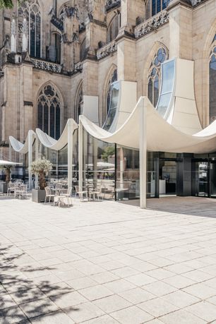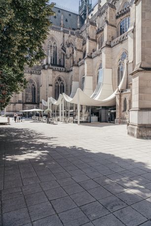 Haimerl hat hier gezeigt, dass er – wo der Bauherr den Freiraum dafür gibt – Architektur auch unter einschränken- den Bedingungen neu denken kann. Nichts an der Lösung mit den drei Baldachinen, die hinter einer zurückgesetzten Glasfassade ein Café, einen Infostand und den Zugang zum Domschatz beherbergen, ist selbstverständlich: weder die Form noch die Materialwahl noch die Zusammenführung so heterogener Funktionen. Mit dem Preis wird der gemeinsame Mut von Bauherrschaft und Architektenschaft ausgezeichnet, einen neuen Eingang zu wagen – trotz Kritik in der Planungs- und Umsetzungsphase. Linz hat damit ein Beispiel geschaffen, wie selbst große, denkmalgeschützte Bauwerke mit Sorgfalt und Augenmaß um zeitgemäße öffentliche Funktionen ergänzt werden können.