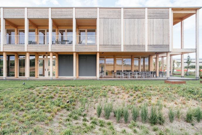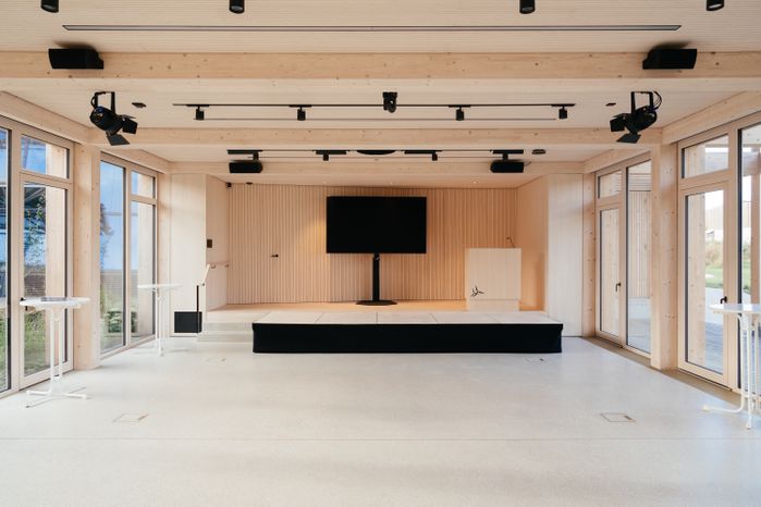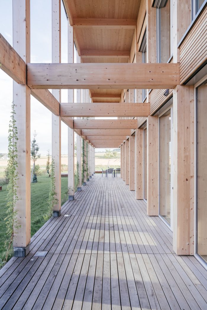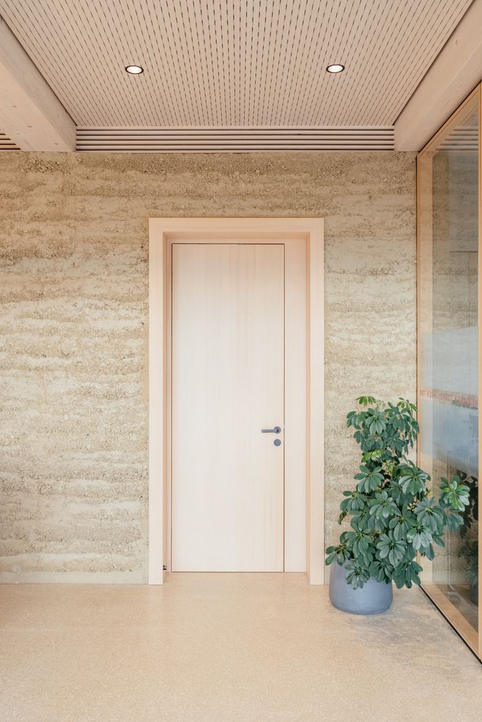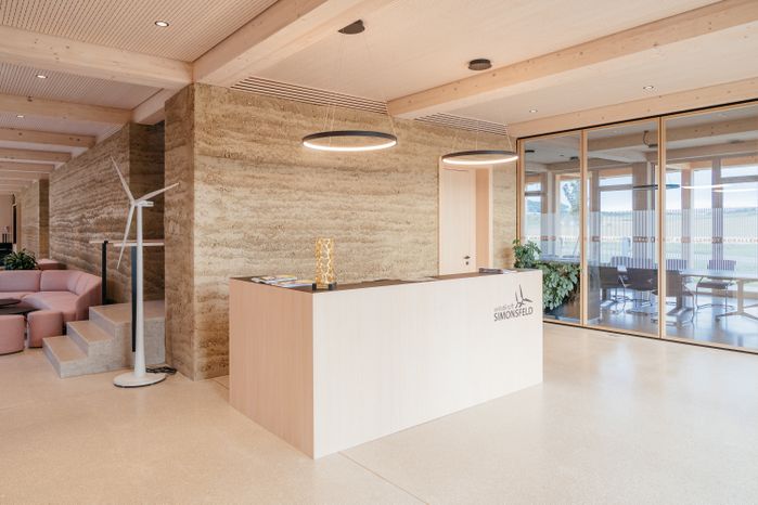 Die Konstruktion basiert auf einem klar gegliederten Holzskelettbau, der durch zwei massive Stampflehmkerne ergänzt wird. Diese übernehmen die Erschließung. Sie sind bauteilaktiviert und regulieren das Raumklima; die notwendige Energie liefern elf Tiefenbohrungen. Holz ist in Konstruktionund Oberfläche stets präsent. Es verleiht den Räumen eine wohnliche Atmosphäre und vermittelt zugleich den Anspruch nachhaltiger Zukunftsfähigkeit. Auch in den Nebenräumen wurde großer Wert auf Gestaltung gelegt.