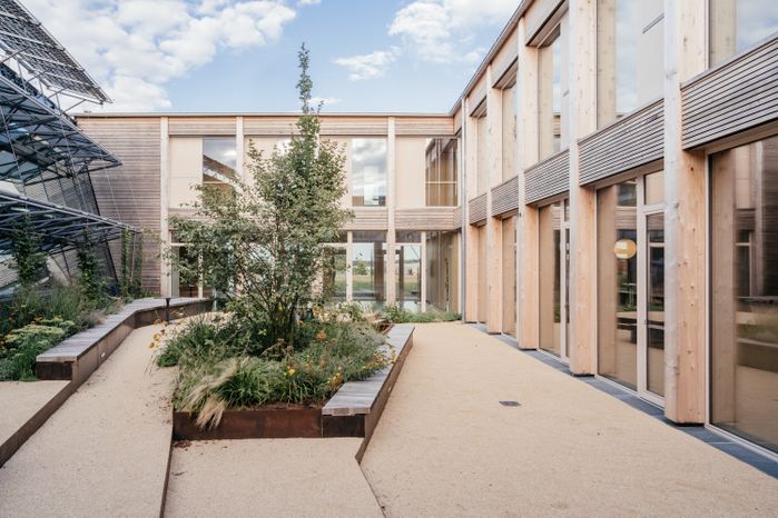 Die Erweiterung schließt das bestehende Gebäude zu einem Vierkanthof und schafft im Zentrum einen grünen Innenhof, der als neues Herz des Unternehmens Begegnung und Kommunikation fördert. Der Bestand wurde eingebunden und beide Geschoße sind nun zu einem Rundgang verbunden, der kurze Wege ermöglicht. Im Erdgeschoß befinden sich um den Eingang herum der Empfang, Besprechungsräume und ein multifunktionaler Veranstaltungsraum. In der Mensa wird mit Gemüse aus dem eigenen Garten gekocht und auf dem Parkplatz können Mitarbeiter ihre Autos kostenlos mit Strom aus der firmeneigenen PV-Anlage laden.
