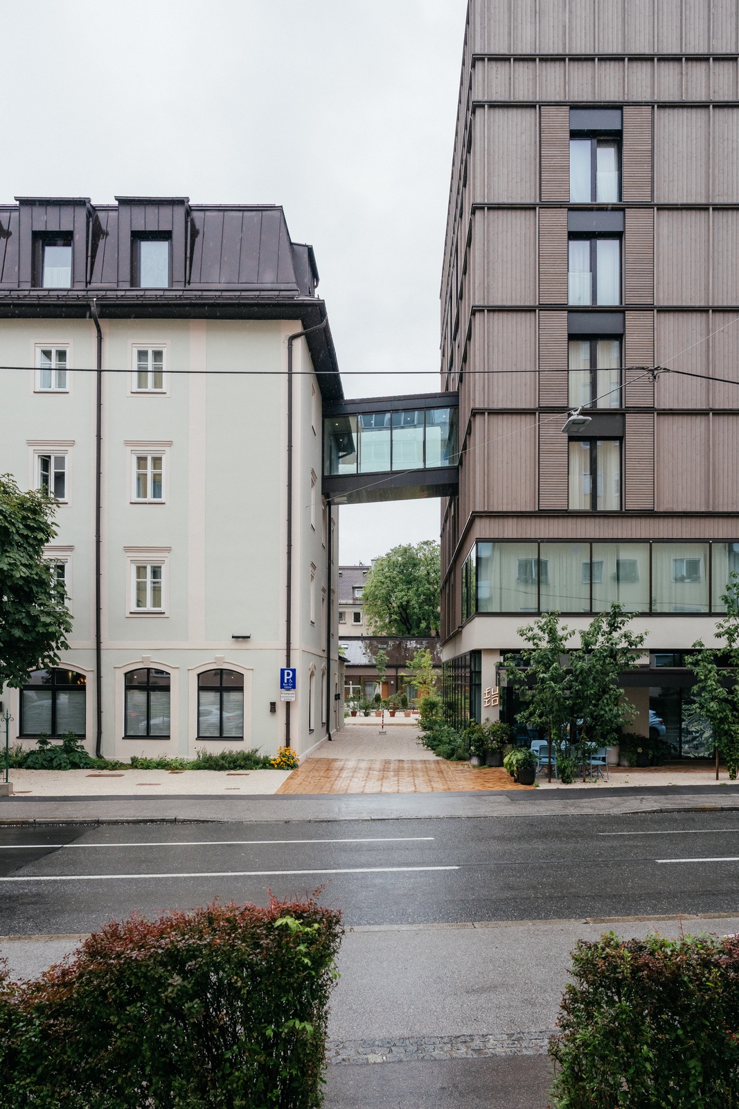 Die Setzung der neuen Baukörper wurde dabei differenziert aus dem heterogenen Stadtgefüge abgeleitet. Sie entwickeln sich in spezifischen Antworten auf den Kontext. Die Hotelerweiterung entlang der St.-Julien-Straße schließt in der Bauflucht an und zeigt sich als Holzbau auf massivem Sockel konstruktiv eigenständig. Historische Lochfassaden werden modern interpretiert und eine Durchfahrt vernetzt zum Innenhof. Zur Elisabethstraße hin ordnet ein solitär gesetzter Hochpunkt die umgebende Baumassenstruktur; seine bauplastische Eigenständigkeit stärkt die Adresse des Hotels. Der Wohnungsbauriegel mit Gewerbe im Erdgeschoß entwickelt durch den Rückversatz zum Straßenraum großzügiges, innerstädtisches Grün und verknüpft den zum Entrée geöffneten Vorgarten des Hotels zu einer maßstäblichen, einladenden Raumfolge. Durch die Fassung des Baublocks entsteht ein qualitätsvoller, urbaner Innenhof. Trotz der Lage im Bahnhofsviertel bleibt dieser für die Vernetzung mit den urbanen Räumen offen, was als sozialräumlicher Beitrag anerkannt wird. Hofseitig vorgesetzte Holzbalkone aktivieren diese neue „Grüne Mitte“ zusätzlich. Das Hotel erhält auf der Spur eines Nebengebäudes eine addierte Bauspange mit Gästeappartements.