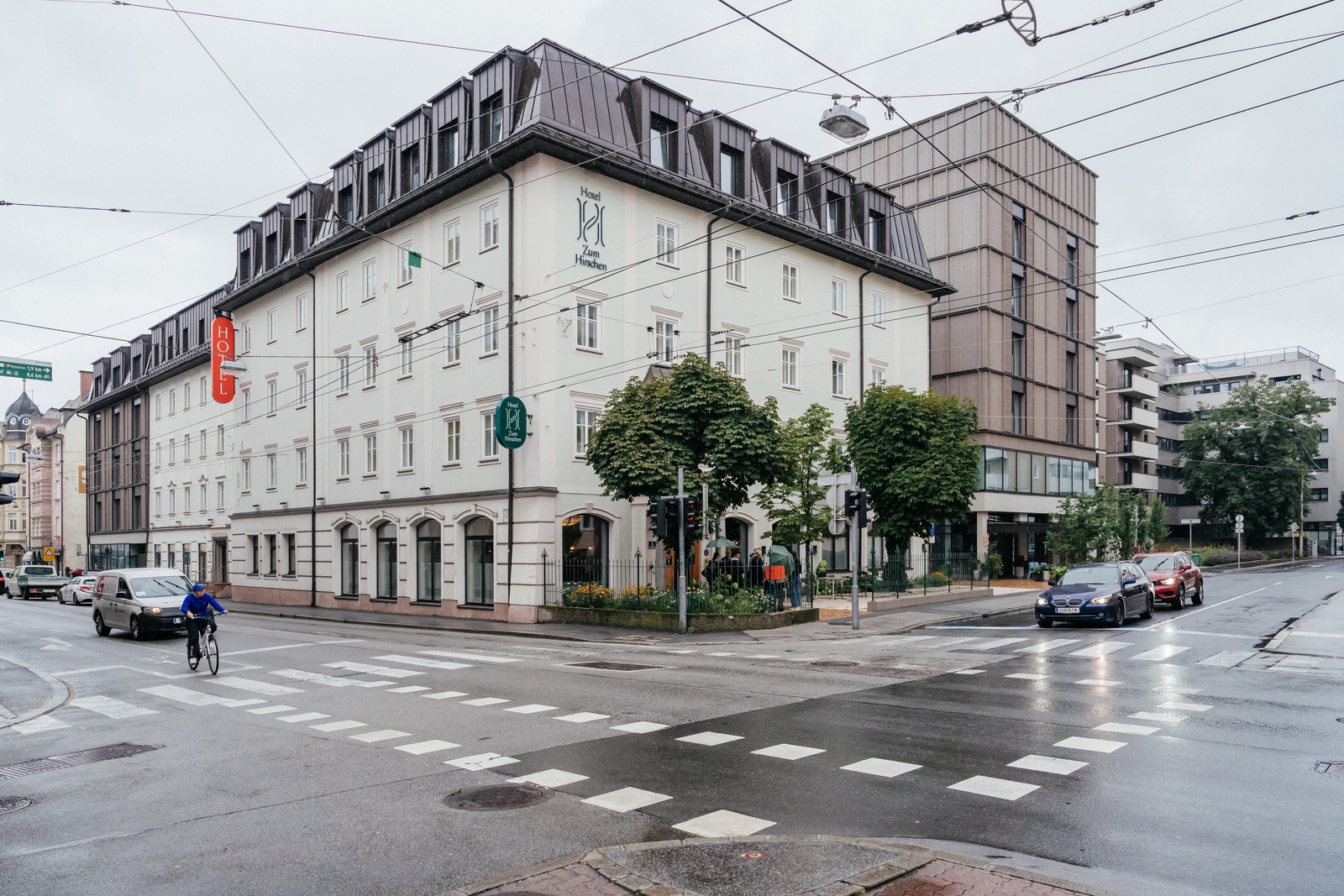 Das im Salzburger Bahnhofviertel gelegene 4-Sterne-Hotel „Hirschenwirt“, das sich seit über 200 Jahren in Familienbesitz befindet, war bereits in die Jahre gekommen, als es 2019 an die nächste Generation übergeben wurde. Ursprünglich war eine klassische Hotelsanierung geplant, doch während der Überlegungen wurde der jungen Hoteliersfamilie sukzessive bewusst, dass ihr mehr vorschwebte als ein klassisches Touristenhotel. So entstand die Idee eines ganzheitlichen Quartiers mit Hotel, Wohnungen, Gastronomie, Gewerbe und viel Grün. Altbestand und Neubauten sollten in Holzhybridbauweise verbunden werden.