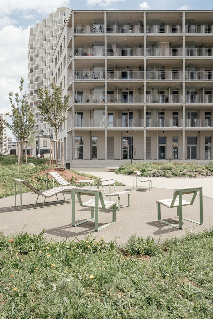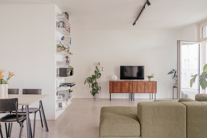 Konstruktiv gelang die gewünschte Flexibilität durch ein klares statisches System: Tragende Außenwände und zentrale Stahlbetonschächte schaffen offene Grundrisse; Wohnungstrennwände und Innenwände sind in Leichtbau ausgeführt. Die großzügigen Laubengänge dienen nicht nur der Erschließung, sondern auch als halböffentliche Begegnungsräume. Vor jeder der Wohnungen– mit Flächen zwischen 46 und 106 m2 – gibt es einen kleinen, individuell nutzbaren Vorbereich, der durch eine leichte räumliche Trennung markiert ist.