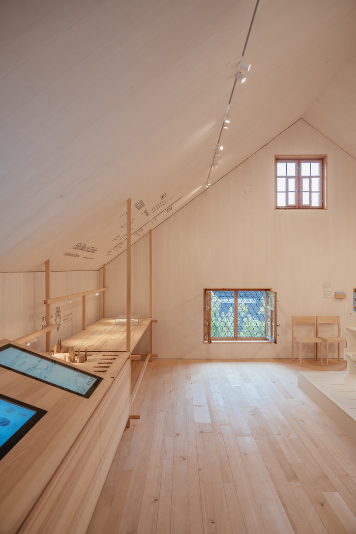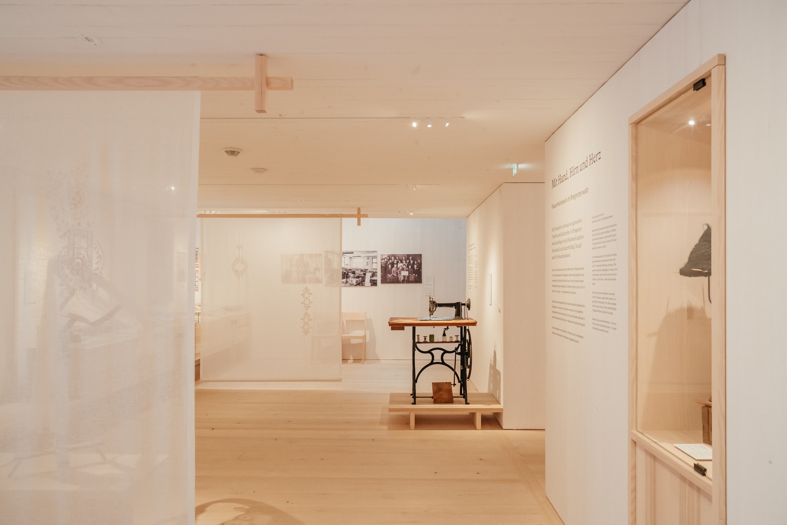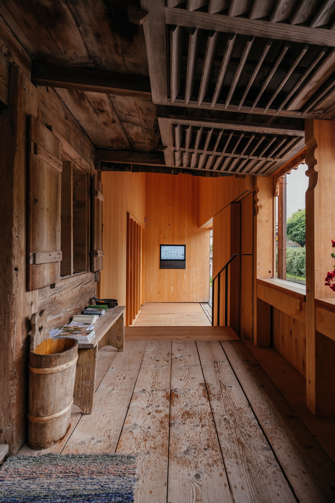 Der verbliebene Teil des Stadels wurde abgetragen und durch einen neuen, sieben Meter langen Baukörper ersetzt. Seine äußerliche Schlichtheit täuscht über die innere räumliche Komplexität hinweg. Öffnet man die einfache Holzschiebetüre, betritt man einen Kassen- und Veranstaltungsraum, von dem aus eine raffinierte Wegeführung den Neubau mit dem historischen Holzhaus verzahnt. Der Strickbau aus dem 16. Jahrhundert, mit niedrigen Räumen und verrußten Originalwänden, wird geschickt in einen Rundgang eingebunden, der schließlich in die weiß gekalkten, holzverkleideten Ausstellungsräume des Obergeschoßes führt. Auch hier gab es Debatten: Ist das Kalken von Holzwänden nicht Verschwendung? Nach intensiven Diskussionen entschied man sich dennoch dafür, da die Flächen so nach wechselnden Ausstellungen leicht erneuert werden können. Neben der Dauerausstellung im alten Haus bietet der Neubau nun Platz für Wechselausstellungen wie „Frauenarbeit und Stickerei im Wald“, oder „Foto Hiller. Bildgeschichte Bregenzerwald“. Für deren inhaltliche Konzeption wurden zusätzlich Fachleute für Museums- und Ausstellungsgestaltung beigezogen – bei dieser Projektgröße und den engen Budgetvorgaben ein bemerkenswerter Schritt.