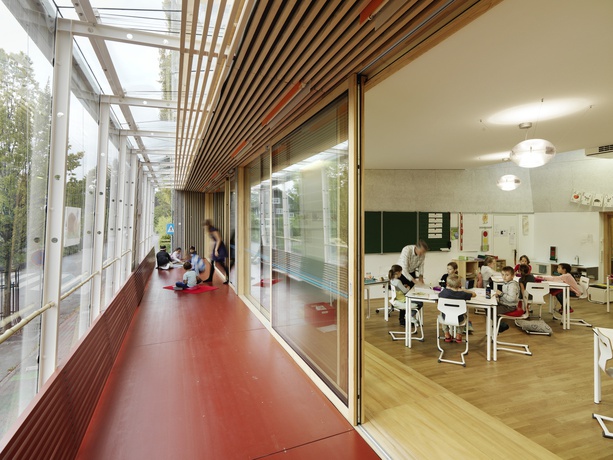 Für Diskussionsstoff hatte nicht nur der pädagogische Neuansatz gesorgt, sondern auch der mögliche Umgang mit dem 80 Jahre alten Bestand sowie die Eingeschossigkeit des Siegerprojekts selbst. Das Wagnis hat sich gelohnt, längst hat das offene Raumkonzept der in vier Clustern zu je vier Klassen organisierten Schule die Bewährungsprobe bestanden. „Heute lieben selbst die früheren Skeptiker unter den Lehrkräften die Schule, die Kinder sowieso“, sagt die Direktorin. Mit ihrem offenen Raumkonzept und den verschränkten Freiflächen ist die Schule für kommende Formen der Ganztagsbetreuung bestens gerüstet. Jeweils vier Klassen öffnen sich nach innen zu einem zentralen „Marktplatz“ für schulstufenübergreifende Aktivitäten und nach außen zu vorgeschalteten Wintergärten (Klimapuffern) mit direkten Austritten ins Freie. Dazwischen eingeschobene Ruhebereiche federn den Bewegungsdrang ab, ein gedeckter Gang stellt die Verbindung zum sanierten Altbau her, in dem sich nun die Werk- und Verwaltungsräume befinden. Etwas abgesenkt im Rücken des Bestands liegt ein zusätzlicher Bewegungsraum bzw. Mehrzwecksaal mit separatem Zugang. Die vorhandene Durchwegung auf dem Areal ist Teil des umfassenden Erschließungsangebots der Schule, deren Cluster jeweils direkt von außen begehbar sind. Die begrünten, von alten Bäumen beschatteten Dächer geben den Kindern die verbaute Bodenfläche als Spielwiese zurück. Im durchlässigen Kontinuum des Holz-Beton-Hybridbaus mit seinen abwechslungsreichen Nutzungsangeboten ist auch der Umgang mit Materialien unverkrampft. Sie bleiben haptisch präsent, sind was sie sind. Die Architektur macht den Kindern nichts vor, sondern schenkt ihnen einfach Raum für Erfahrung.