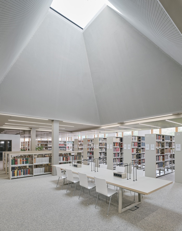 Den Fußabdruck auf dem Areal so klein wie möglich zu halten, war den Architekt:innen ein zentrales Anliegen. Sie komprimierten die Kubatur zugunsten einer frei zugänglichen Campuswiese – und schufen damit einen offenen städtischen Grünraum am Inn, der sofort mit Leben erfüllt war. Das kompakte Gebäude mit einer tragenden Fassade aus Stahlbetonfertigteilen folgt einem sachlichen Duktus; ein 10-geschossiger Trakt verankert den Bau an der Straßenkante sichtbar im Stadtraum. Die bogenförmigen Öffnungen des Sockels und das von Peter Sandbichler skulptural facettierte Portal des Haupteingangs verfehlen ihre Sogwirkung nicht. Wiesenseitig führt eine breite Grüntreppe zu den beiden großen Hörsälen hinunter, die Mensa im Erdgeschoss öffnet sich Richtung Inn. Im Atrium – dem Herzstück des Baus – werden Studierende und Besucher:innen von einer Kaskade aus Treppen und Stegen empfangen, die die Institute frei im Raum vernetzen. Interne Sicht- und Wegbeziehungen zwischen den Fachbereichen, temporären Arbeitsplätzen, Gruppenräumen und der Bibliothek verstärken das Selbstverständnis einer Universität als kollaboratives Wissenslabor.