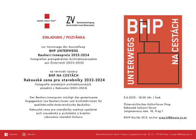 Der österreichische Bauherr:innenpreis macht auch international die Runde — die Ausstellung BHP UNTERWEGS macht heuer auch in Prag Halt und zeigt die ausgezeichneten Projekte der Jahre 2022 -2024 ! Vom 05.06. bis 19.09. ist sie im österreichischen Kulturforum Prag - Rakouské kulturnií fórum v Praze - zu sehen