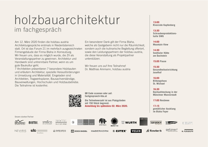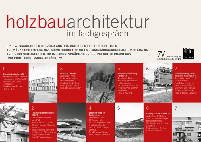 Am 12. März 2020 finden die holzbau austria Architekturgespräche erstmals in Niederösterreich statt. Ort ist das Forum 21 im mehrfach ausgezeichneten Firmengebäude der Firma Blaha in Korneuburg. Wir freuen uns, dass es möglich wurde, die ZV als Veranstaltungspartner zu gewinnen. Architektur und Handwerk sind untrennbare Partner, wenn es um gute Baukultur geht.