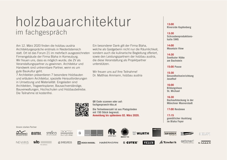 Ein besonderer Dank gilt der Firma Blaha, welche als Gastgeberin nicht nur die Räumlichkeit, sondern auch die kulinarische Begleitung offeriert, sowie den Leistungspartnern der holzbau austria, die diese Veranstaltung als Projektpartner unterstützen.