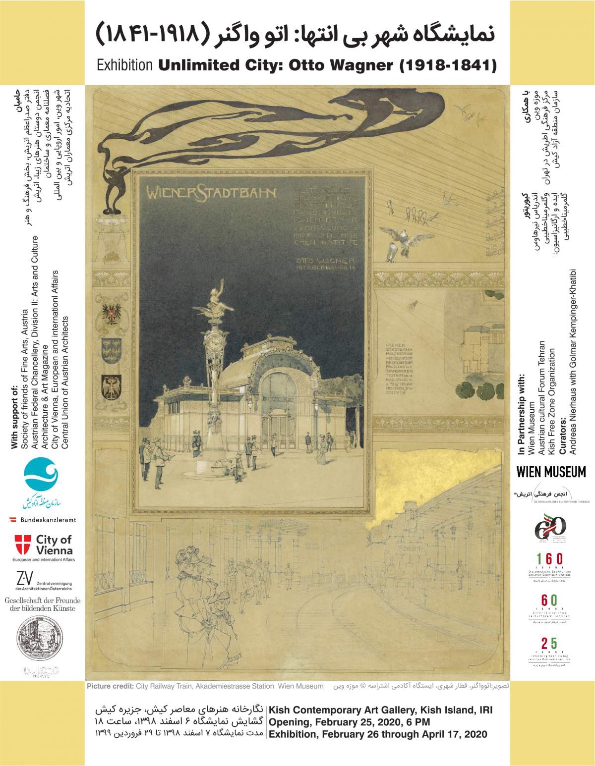 AusstellungDie Wanderausstellung zum Werk von Otto Wagner (1841-1918) wird von 26.2.–19.3.2020 in Kish (Iran) präsentiert. Sie basiert auf Objekten aus der Sammlung des Wien Museums und wurde von Architektin Golmar Kempinger-Khatibi konzipiert. Bereits 2019 wurde sie mit Unterstützung der ZV Österreich in Teheran (Iran) gezeigt und von großem Publikumsinteresse begleitet.