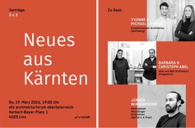 Architekturvortrag, KärntenDas beliebte Vortragsformat geht weiter: Anlässlich der heurigen ZV:Exkursion nach Kärnten (17.-19. April) freuen wir uns, vorab drei Kolleg*innen aus diesem Bundesland in Linz begrüßen zu dürfen. Mit "3x3" - 3 Veranstaltungen im Jahr, jeweils 3 Vortragende - holt die Zentralvereinigung der Architekt*innen nicht nur aktuelle Architektur vor den Vorhang, sondern möchte auch das Netzwerk von Architekturschaffenden stärken und auch angehenden Architekt*innen einen Einblick in den beruflichen Alltag geben.