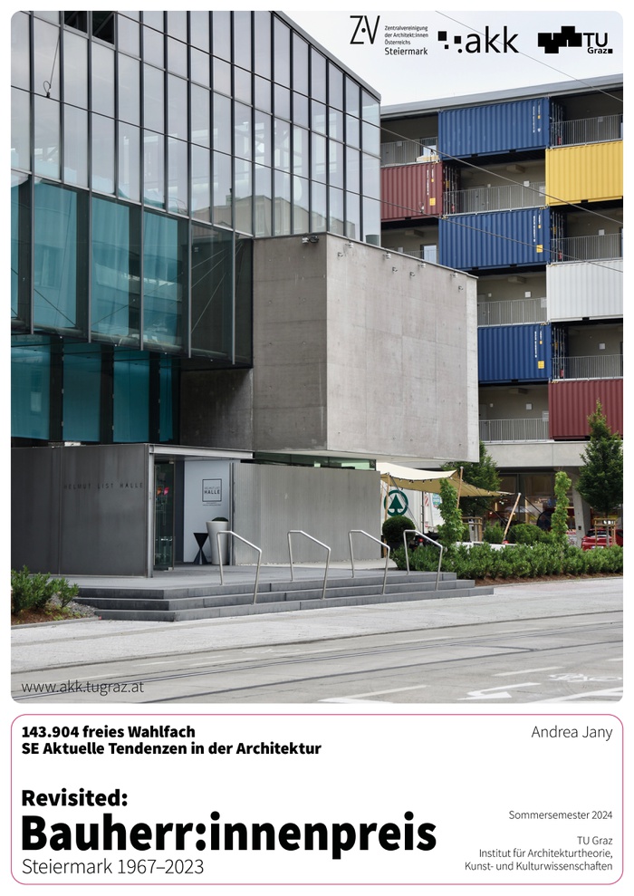 Aktuelles, Seminar, Bauherr:innenpreisWir freuen uns in Zusammenarbeit mit dem Institut für Architekturtheorie, Kunst- und Kulturwissenschaften ein freies Wahlfach an der Technischen Universität Graz zu den Bauherr:innenpreisen in der Steiermark anbieten zu können!