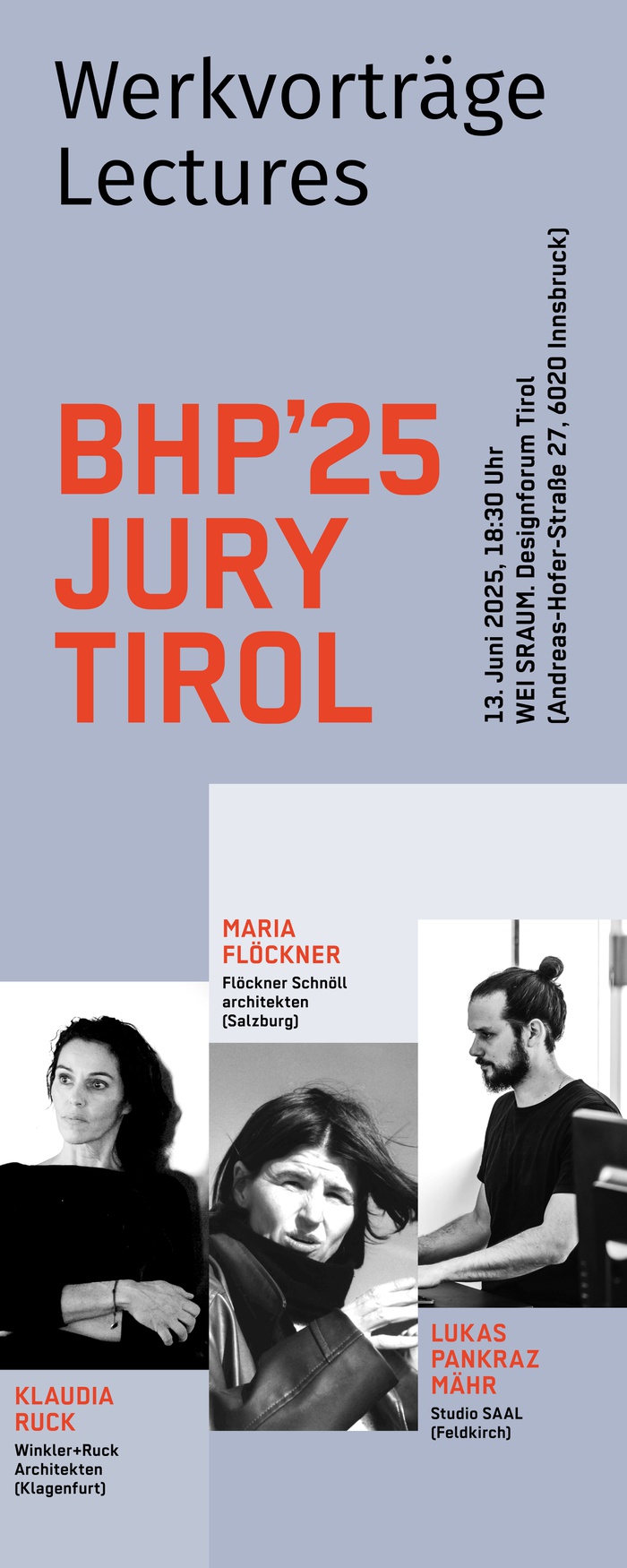 Im Rahmen der Juryfahrt lädt die ZV Tirol die Nominierungsjuror:innen dazu ein, am 13.06. um 18:30 Uhr Werkvorträge über ihre Arbeit zu halten.
