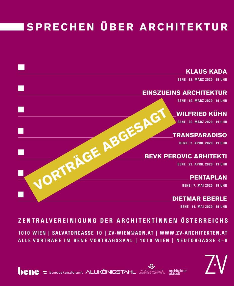 Aufgrund der neuesten Entwicklungen sowie dem Maßnahmenpaket der Bundesregierung werden die geplanten Sprechen über Architektur-Veranstaltungen vorerst abgesagt.