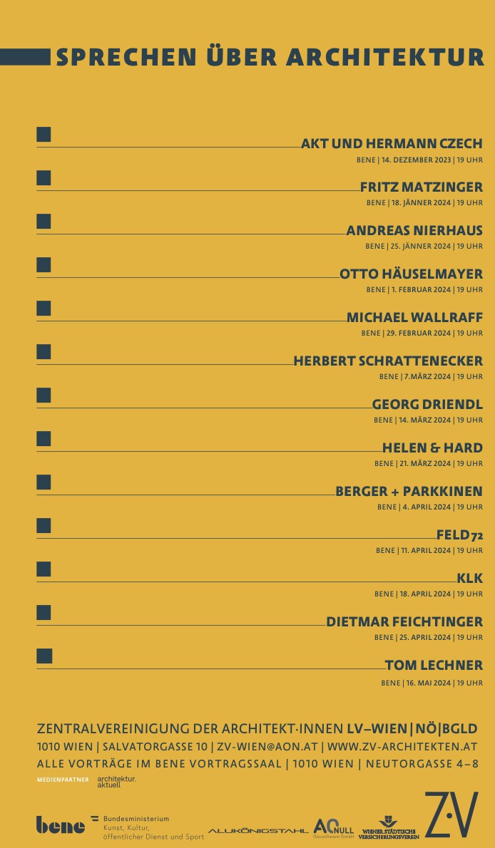 Seit 1967 lädt die ZV Wien, NÖ und Bgld. zur Vortragsreihe „Sprechen über Architektur“ ein. Architektinnen und Architekten verschiedener Generationen, Stars, Etablierte, Radikale, und auch Künstler sowie Theoretiker sprechen über Architektur und ihre Arbeiten. Sie zeigen einen Ausschnitt aus der hohen Qualität der Architekturproduktion und des architektonischen Denkens in den verschiedenen Bundesländern Österreichs.