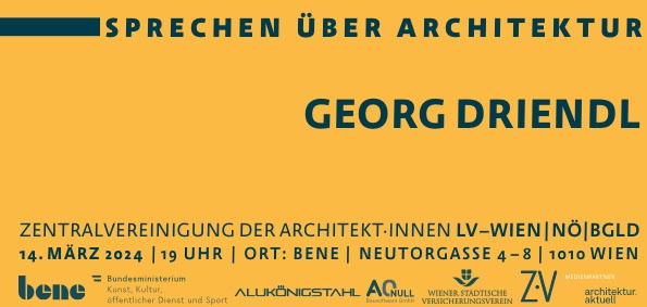 Geboren 1956 in Innsbruck, schließt Georg Driendl sein Studium in Architektur an der Akademie der Bildenden Künste in Wien im Jahr 1983 ab. Im Jahr 1996 gründete er das international tätige, unabhängig planende Architekturbüro driendl*architects ZT GmbH. Das Büro entwickelt prototypische Lösungen für eine große Bandbreite von Planungsaufgaben, vom Städtebau und städtischer Infrastruktur bis zum Wohnbau und zur Möbelausstattung. Zu den herausragenden Projektbeispielen aus den letzten Jahren gehören der Masterplan für das Spallartviertel in 1140 Wien sowie zwei, in diesem Neubauviertel befindliche Geschosswohnbauten, Cable-Car-Anlagen für ein öffentliches Verkehrssystem in Quito, Ecuador und Gestaltungen für den Tresor, die Gasträume und den Vorplatz des Stifts Klosterneuburg.