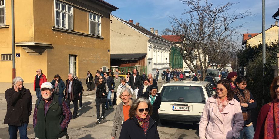 Der geführte Spaziergang führte weiter über den Weidlingbach durch die Mittelstraße, die am Fuße prächtiger Weingärten liegt, vorbei an sehr unterschiedlich dimensionierten Einfamilienhäusern von einst und jetzt. Halt gemacht wurde an einem Kinderspielplatz, der „reguliert und beschönt" wurde. Die Gruppe bedauerte den Verlust der „wilden Böschung“ und die nunmehr fehlende Beschattung und regte einen Naschobst-Garten an. Unweit davon wurde über das Areal der ehemaligen Freiwilligen Feuerwehr, das einem Wohnbau weichen wird, debattiert. Kindergarten und Apotheke sind im Erdgeschoß angedacht. Der Ruf nach einem Verkehrskonzept war nicht zu überhören.