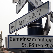 Landschaftsarchitekt und Spaziergangsleiter Dominik Scheuch startete den Rundgang am Rathausplatz (Planung: Boris Podrecca) vor dem Wegweiser der Kulturhauptstädte Europas, der derzeit mit all seinen Anzeigern ganz im Verkehrszeichen-Design den bereits seit 30 Jahren autofreien Freiraum ziert. Den Schriftzug „SANKT“ hatte er auf einem Schild mitgebracht – exakt abgestimmt auf die Farben der Europäischen Union. Von da aus brach die etwa 60-köpfige Gruppe auf, nicht ohne den verheißungsvollen Satz „Die Stadt ist mir heilig.“ zu hinterlassen.