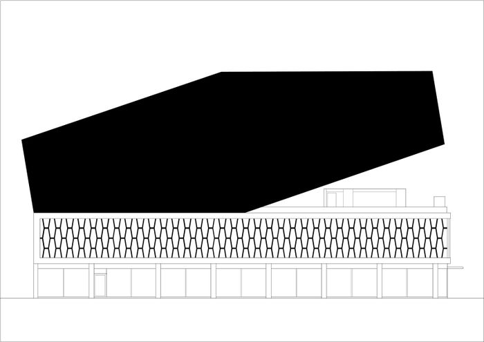 Neben der Analyse der Grundrisse und den sich daraus ergebenden Möglichkeiten zur Flächenteilung und Aufstockung des Gebäudes, habe ich einen zweiten großen Themenkomplex bearbeitet, der sich mit der Interpretation der ins Raster gesetzten Stahlbeton-Struktur des Hauses durch Projektion, Spiegelung, Teilung und Drehung beschäftigt. In dieser Vorgehensweise kommt eine kritische Distanz zum architektonischen Inventar des Hauses, insbesondere zu der alles dominierenden Wabenfassade zum Ausdruck. Das Motiv einer Reflektion des Vorhandenen bei gleichzeitiger Nutzbarmachung, ohne dabei als Paraphrase im Raum stehen zu bleiben, tritt produktiv werdend in den Vordergrund.