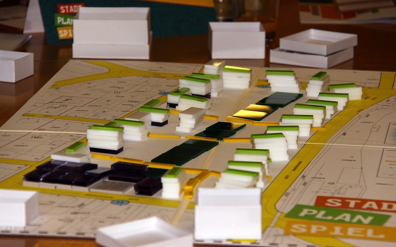 A large piece of property must be transformed into an attractive, well-connected urban neighborhood in which around 1,000 people can live and work. Eight different roles with predefined expectations, wants, and fears are assigned to the players. The challenge is to work out a development plan and, after two rounds of negotiations with developers, building authorities, politicians, future users, and neighbors – all played by the children – to vote on a solution that makes everybody happy. Support is provided by development suggestions and regulations. Urban development regulations, such as providing access to public transport, must be followed. The Fair Play Card forbids the use of any type of threats or blackmail to force a solution.