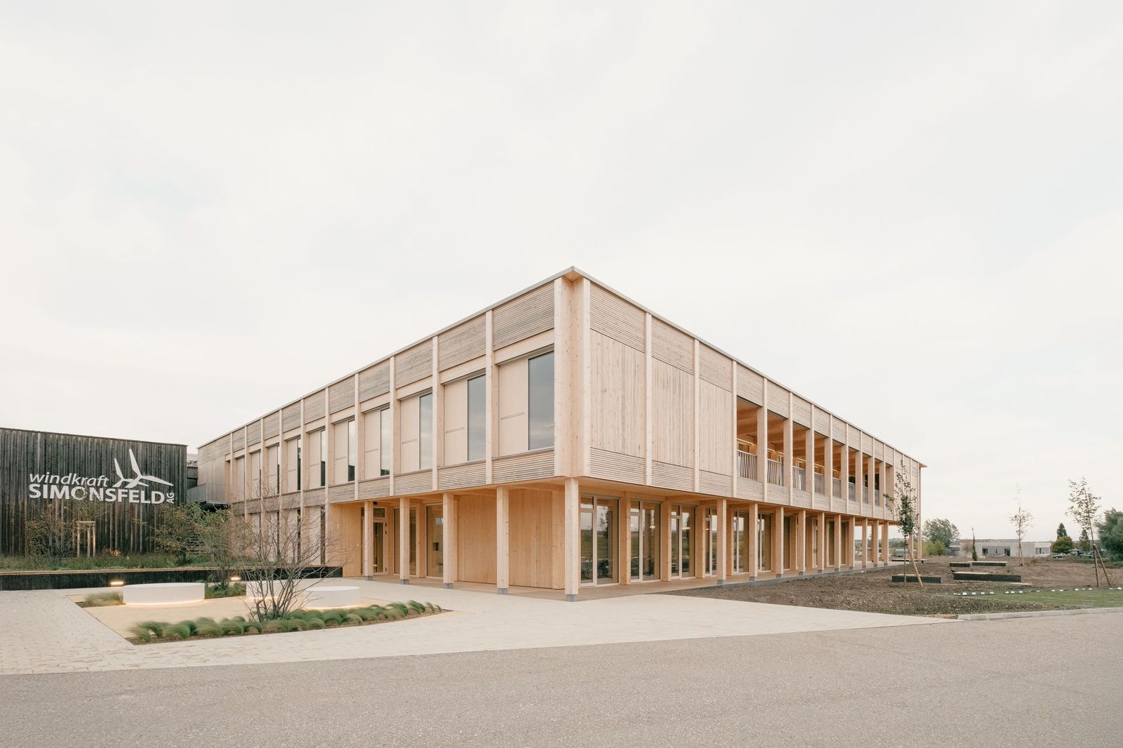 ORTE vor Ort - BauvisiteAufgrund des steigenden Wachstums des Unternehmens Windkraft Simonsfeld AG in Ernstbrunn war eine Erweiterung des von Georg Reinberg geplanten Bestandsgebäudes notwendig geworden. Es folgte ein Wettbewerb, den Jury Troy 2022 gewann. Der Neubau dockt an zwei Stellen an den Bestand an und lässt im Zentrum ein gemeinschaftliches Atrium frei, das als Verbindungsstück und Kommunikationsbereich für Alt- und Neubau fungiert. Damit wird eine kompakte Kubatur geschaffen, die möglichst wenig in den Bestand eingreift, ihn weiterführt und im neuen Ganzen integriert.