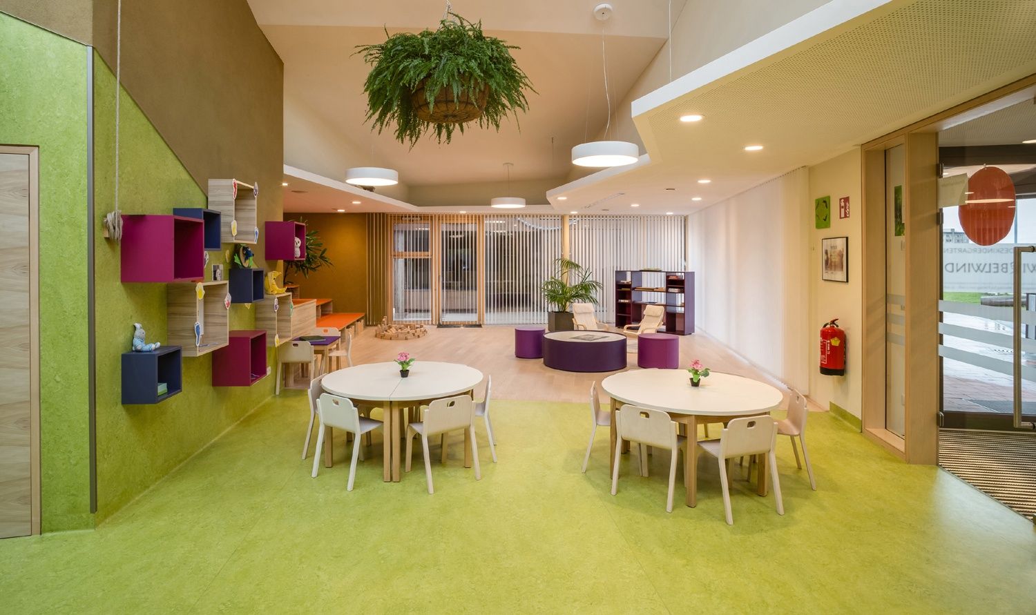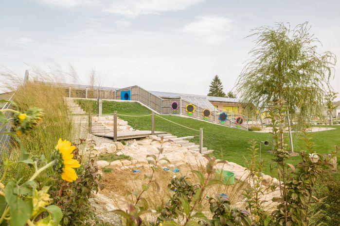 Der 2015 fertiggestellte und 2017 erweiterte 6-gruppige Kindergarten-Neubau in Holzriegelbauweise entspricht dem Passivhausstandard unter Verwendung ökologischer Baumaterialien und beinhaltete ebenso die Mitgestaltung des öffentlichen Raums.