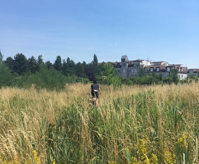 Wir werden Stellen suchen, um die durchschneidenden Verkehrsachsen sicher zu überqueren, und den durch die Straßen abgeschnittenen jüdischen Friedhof besuchen. Wir werden an der Hafenmündung Richtung Weltkulturerbe blicken, an wild verwachsenen Grundstücken zwischen Firmen- und Fabrikkomplexen vorbeifahren, von der Sonne blond gefärbte Gstätten entdecken, über Brücken und an Schienen vorbei uns der Siedlung Lerchenfeld nähern. Vielleicht stoßen wir dort auf sichtbare Überbleibsel der Arbeiterkultur, weite, grüne Höfe, gepflegte Gärten, gemeinschaftliche Grünraumnutzung.