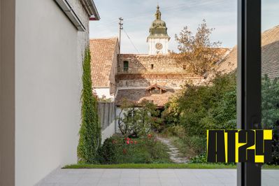 Die Häuser liegen im Zentrum von Guntramsdorf. In einem städtebaulich heterogenen Umfeld verbinden sie bestehende mit neuer Architektur. X42 Architektur hat die Wohntypologie „Reihenhaus“ für diesen speziellen Ort neu interpretiert: Der bestehende Gebäudeteil der ehemaligen Schuhleistenfabrik an der Hauptstraße wurde umgebaut und erweitert. Im hinteren Teil des Nord-Süd gestreckten Grundstücks haben die PlanerInnen sieben Stadthäuser mit jeweils einem eigenen, vorgelagerten Garten auf einem offenen Garagendeck in einer Zeilenstruktur angeordnet. Die Aufenthaltsräume im Erdgeschoss orientieren sich zu diesen introvertierten Gärten hin.