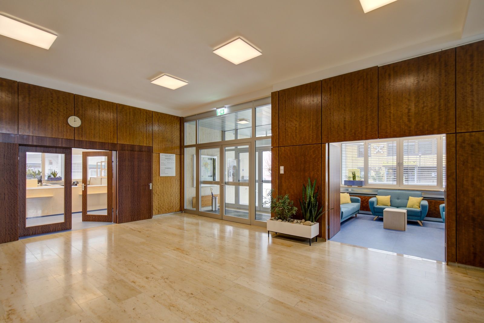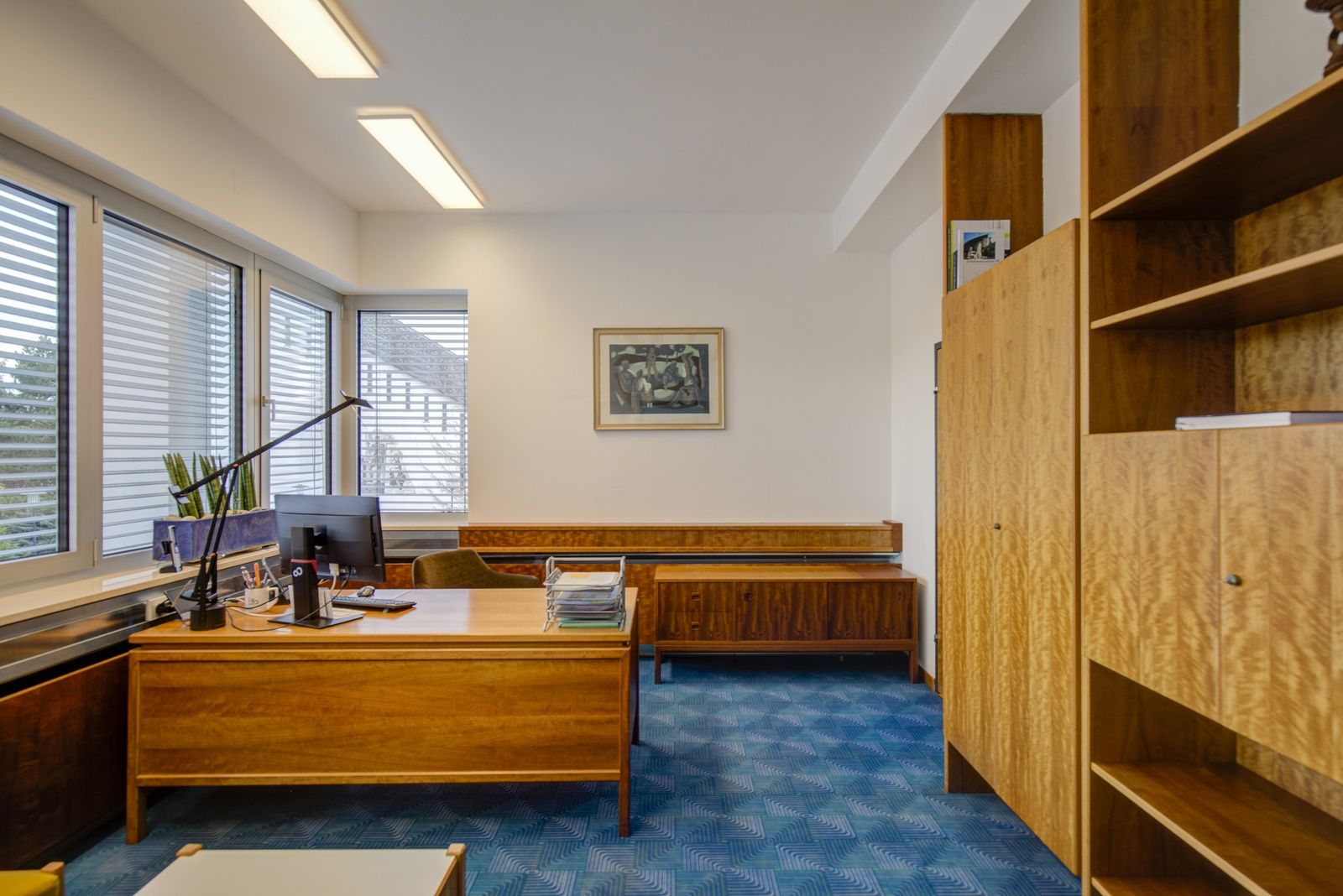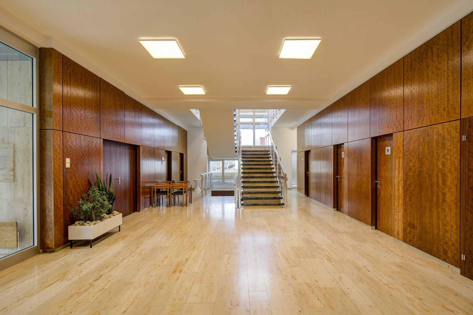 Die ungedämmten Bandfenster und deren Beschattung wurden vollständig ersetzt und dabei ein dem original kohärenten Gesamteindruck aufrechterhalten. Die restliche Fassade sowie das Untergeschoß wurden konsequent innen mit Glasschaumplatten wärmegedämmt und damit die aussenliegenden schlanken Stützen und den großformatigen Keramikplatten im Originalzustand erhalten. Im Sinne der beanspruchten Nachhaltigkeit wurde das Heizsystem von Gas (ursprünglich ÖL) auf Nahwärme umgestellt. Die elektrischen und haustechnischen Installationen erneuert und das Lichtsystem konsequent auf LED umgestellt.