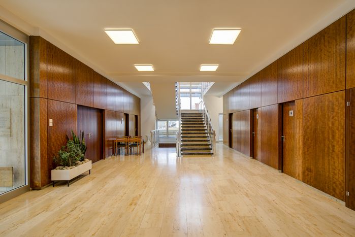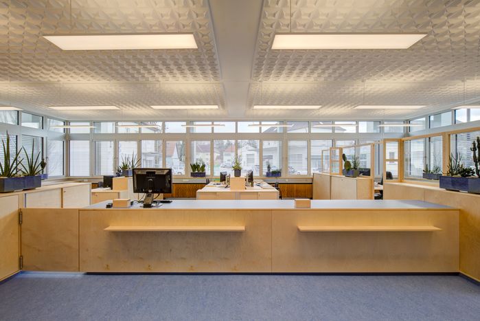 Für den Aus- und Umbau des Rathauses wurden zu Beginn der Planung mehrere Szenarien gegenübergestellt und diskutiert: vom vollständigen Neubau, über die weitgehende Entkernung bis hin zur großen beziehungsweise sanften Sanierung. Letztere konnte schließlich überzeugen – durch kurze Bauzeit, kostengünstige Umsetzung, Stärkung der bestehenden Vorzüge und Beibehaltung der Identität, die diesem Haus über die 50 Jahre seines Bestehens erwachsen ist. Die nachhaltige „sanfte“ Sanierung baut auf dem Konzept der 1970er Jahre auf und ergänzt die Originalsubstanz ohne deren Räume und Anmutung in Materialität und Proportion zu schmälern. Dies beinhaltet neben der selbstverständlichen barrierefreien Erschließung, die konsequente Dämmung, die Erneuerung der haustechnischen Anlagen sowie ein neues räumliches Verständnis einer kommunalen Verwaltung.
