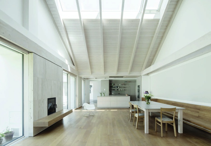 Der Neubau zeigt sich wie eine Wand aneinander gereihter Häuser archetypischer Form. Sein Baukörper verbindet qualitätsvolle Innenräume mit hohen Raumvolumen und einer ästhetischen Schlichtheit. Das Material entspricht dem Einsatz und Maßstab örtlich vorgefundener Bauweisen. Die tragenden Wände bestehen aus zweischaligem, teils mit Schuttmaterial gefülltem Mauerwerk aus 25 cm Hochlochziegeln, deren massiver Eindruck durch Faltung ihrer äußeren Wandschicht verstärkt wird und sich gartenseitig großzügig öffnet. Darüber ruht der helle hölzerne Dachstuhl mit Satteldächern.