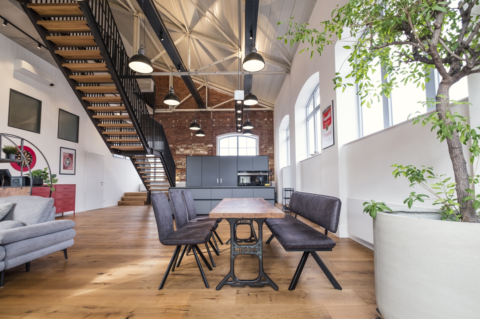 Zeitgenössisches Wohnen findet in der ehemaligen Spinnerei in Oberwaltersdorf statt, wo Architekt Veit Pedit aus den Überresten der ehemaligen Baumwollspinnerei aus dem frühen 19. Jahrhundert bereits 2012 großzügige Räume mit angebauten Balkonen und einer weit über die Triesting auskragenden Terrasse schuf.