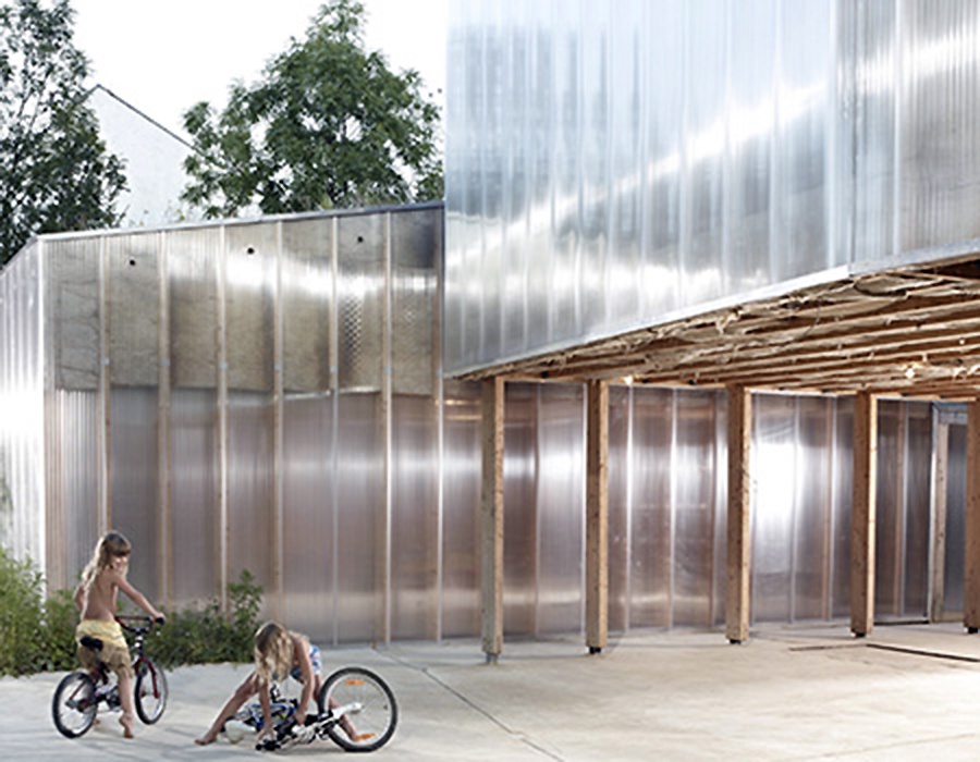 2012 wurde diese 'Wohnlandschaft', die zwei Wohnhäuser umfasst, mit ökologischen und kostengünstigen Materialien realisiert.