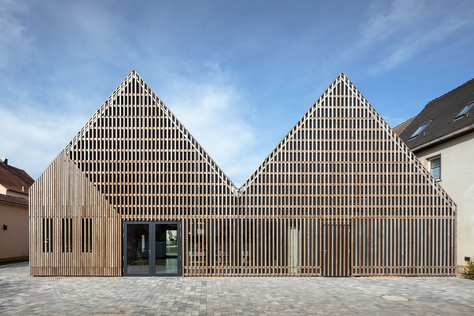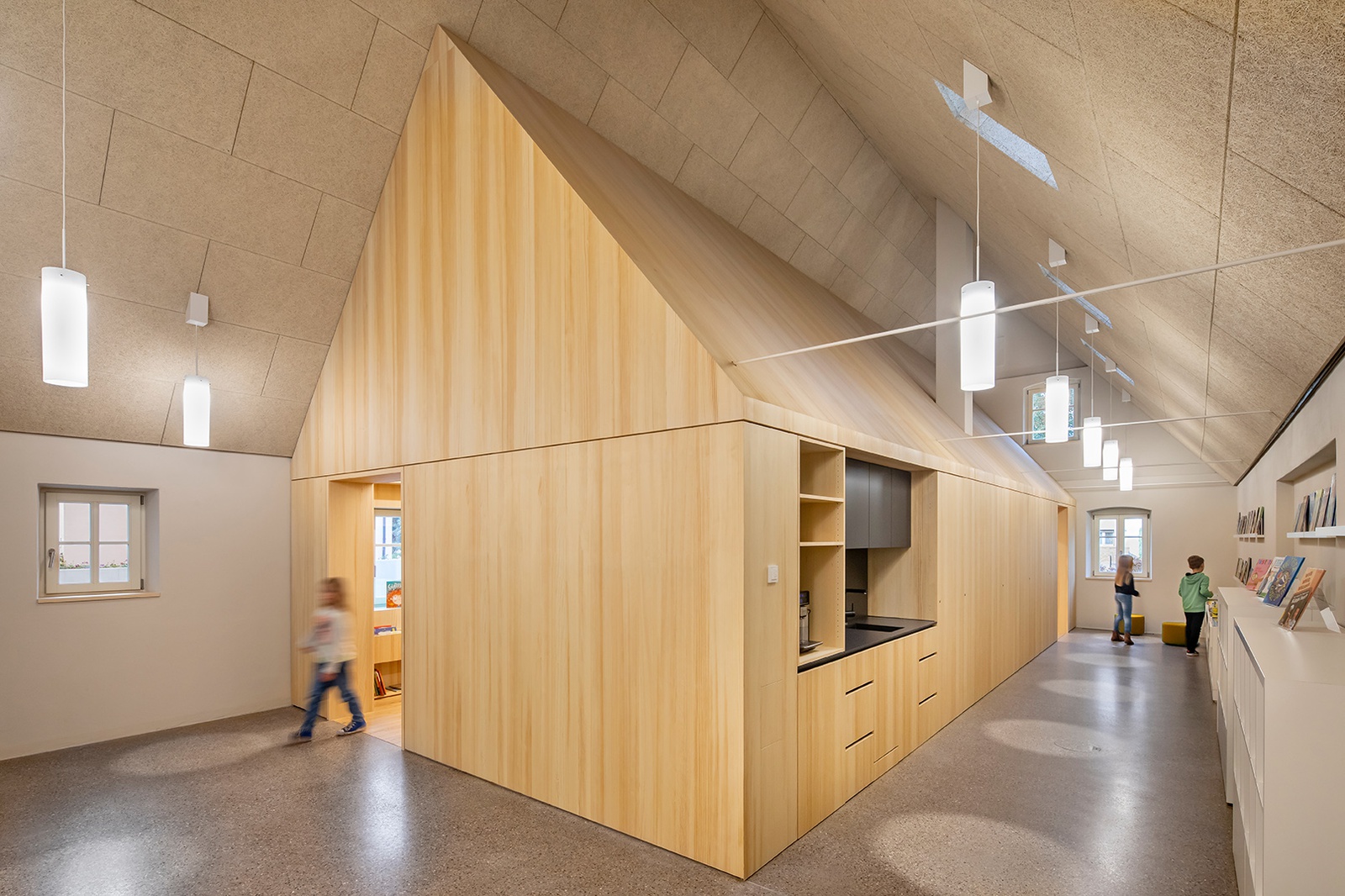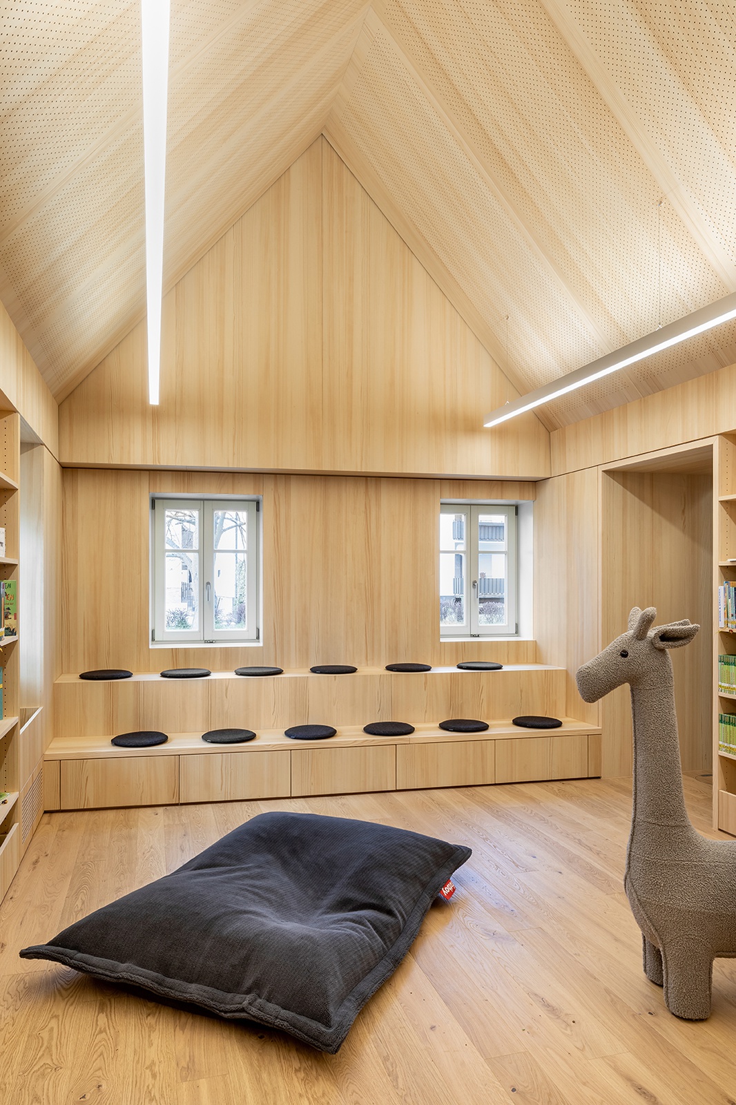 „Die Bücherei ist aus der Absicht der Gemeinde entstanden, ein bestehendes, ortsbildprägenden Wohnstallhaus zu erhalten und zu reaktivieren und unter Einbezug der Bürger:innen eine geeignete Nutzung zu finden. Sie greift die Maßstäblichkeit und Körnung der Ortsmitte auf und reiht sich behutsam in die Nachbarbebauung ein. Durch Umbau und Erweiterung ist aus dem Wohnstallhaus ein vielseitiges Zentrum für die Gemeinde entstanden. Nicht nur als Architekturprojekt, sondern auch auf der Ebene der Entscheidungsträger:innen und privaten Eigentümer:innen soll das Projekt motivieren, inspirieren und zur Nachahmung anregen.“ (Schlicht Lamprecht Kern Architekten)