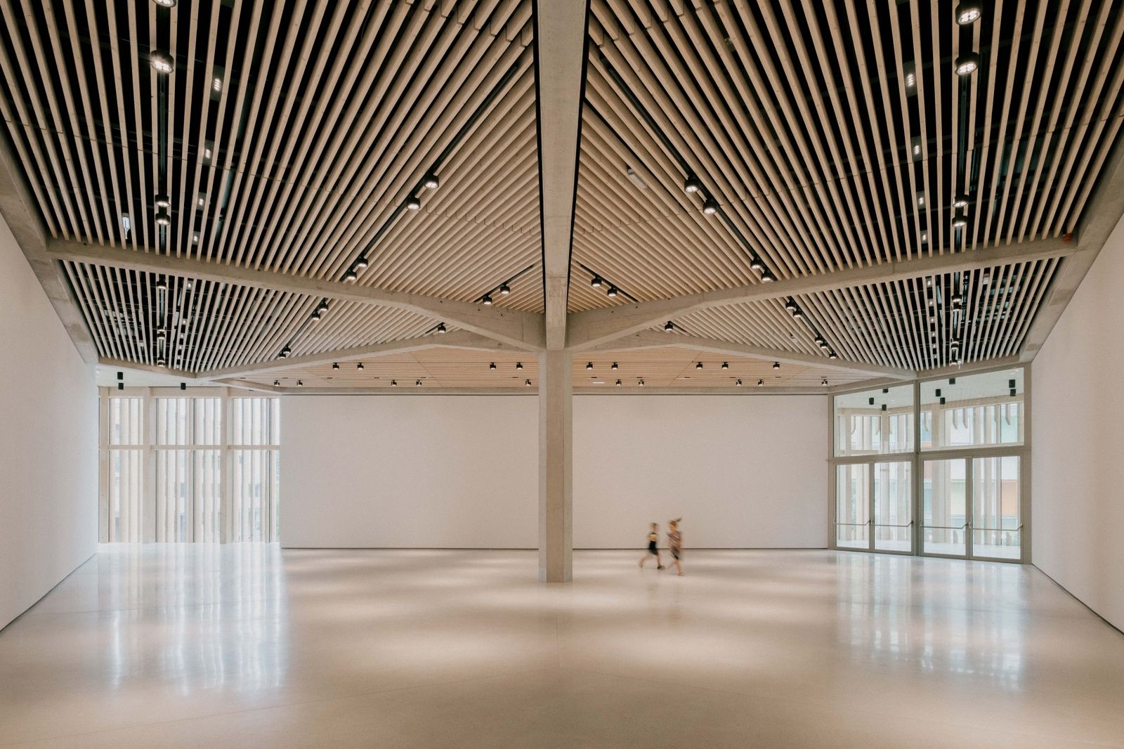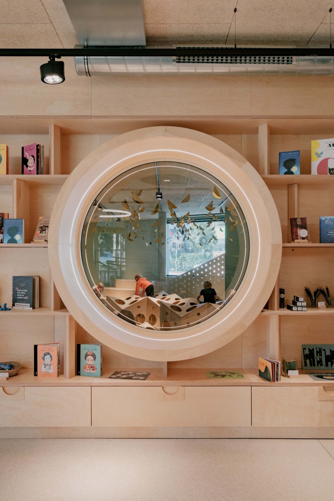 „Erwachsene verlaufen sich immer, Kinder nie“, sagt die künstlerische Leiterin Mona Jas im Entree. Die gestufte Portalöffnung gibt es an allen drei Gebäudeseiten, der umlaufende Sockel fungiert als Sitzbank im Freien. Der Lamellenvorhang der Fassade öffnet das KinderKunstLabor zur Umgebung und sorgt im Inneren für ein bewegtes Licht/Schatten-Spiel. Dass es in diesem Haus auf allen Ebenen um künstlerische Erfahrungsräume geht, ist auch auf der Spielterrasse im 3. Obergeschoss spürbar: Hier können Kinder in Höhe der Baumkronen eine textile Netzlandschaft erklimmen, die die japanische Künstlerin Toshiko Horiuchi MacAdam eigens für diesen Ort geschaffen hat. (Text: Gabriele Kaiser, erschienen in architektur aktuell 11.2024)