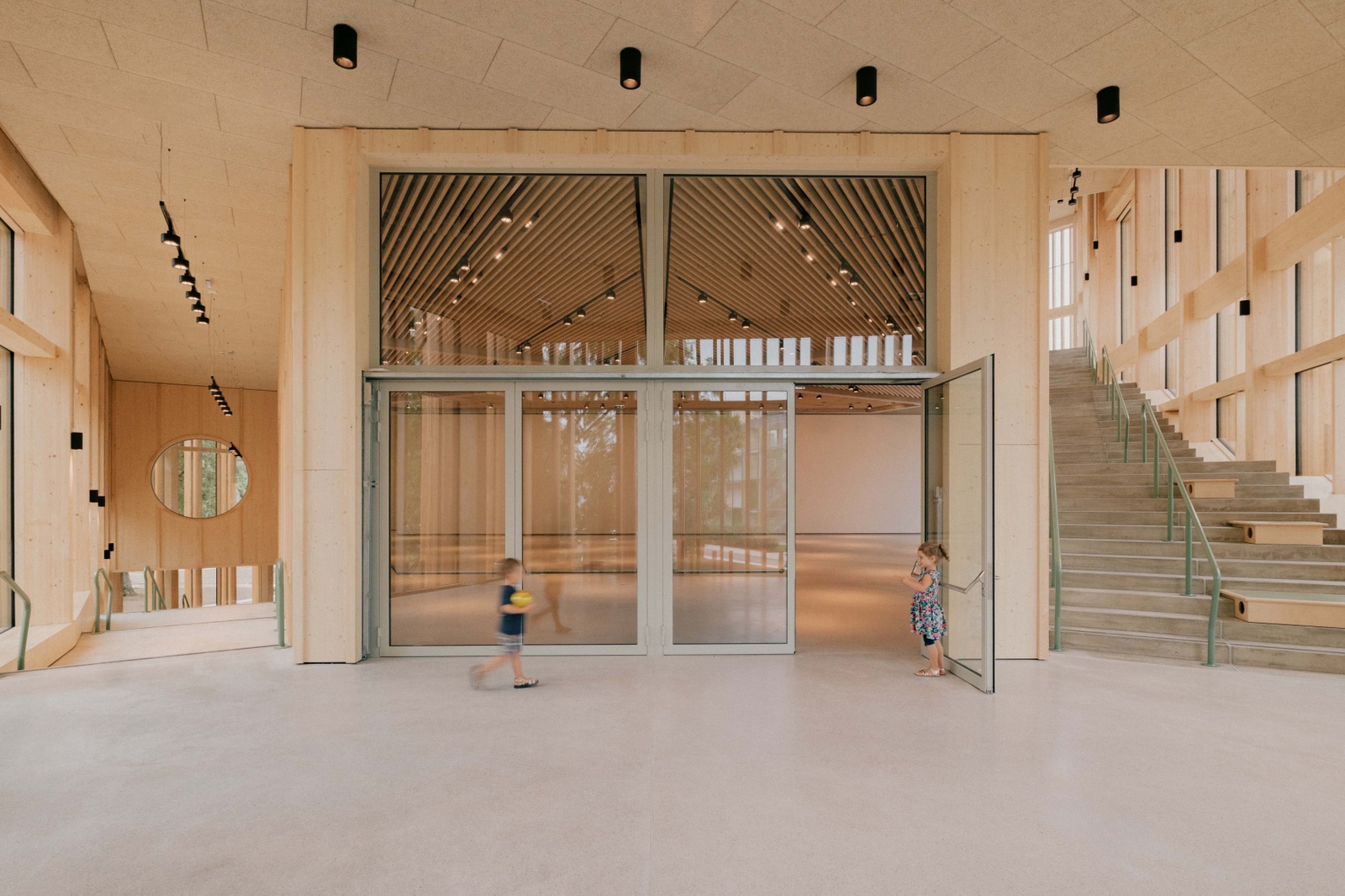 Auf das visionäre Konzept und die beispiellose Aufgabenstellung reagierten die Architekten ohne „vorgefertigte Bilder“. Sie entwickelten einen kompakten viergeschossigen Holzbau (mit Betonkern), dessen Grundrissgeometrie aus einem gleichseitigen Dreieck mit gekappten Ecken und leicht nach innen geknickten Seitenwänden besteht. Das in dieser Figur angelegte Drehmoment wird durch die hinaufführenden Spiel- und Sitztreppentribünen und Betonstütze betont, die wie eine Radnabe inmitten des Ausstellungssaals steht. Die konkrete Nutzung und Gestaltung der Räume – von den In- und Outdoorlabors über die Ausstellungsflächen bis hin zur Bibliothek ganz oben – wurde anhand eines Gebäudemodells in Workshops mit eigens eingesetzten Kinderbeiräten entwickelt: ein von den Architekten mit Emphase begleiteter Prozess.