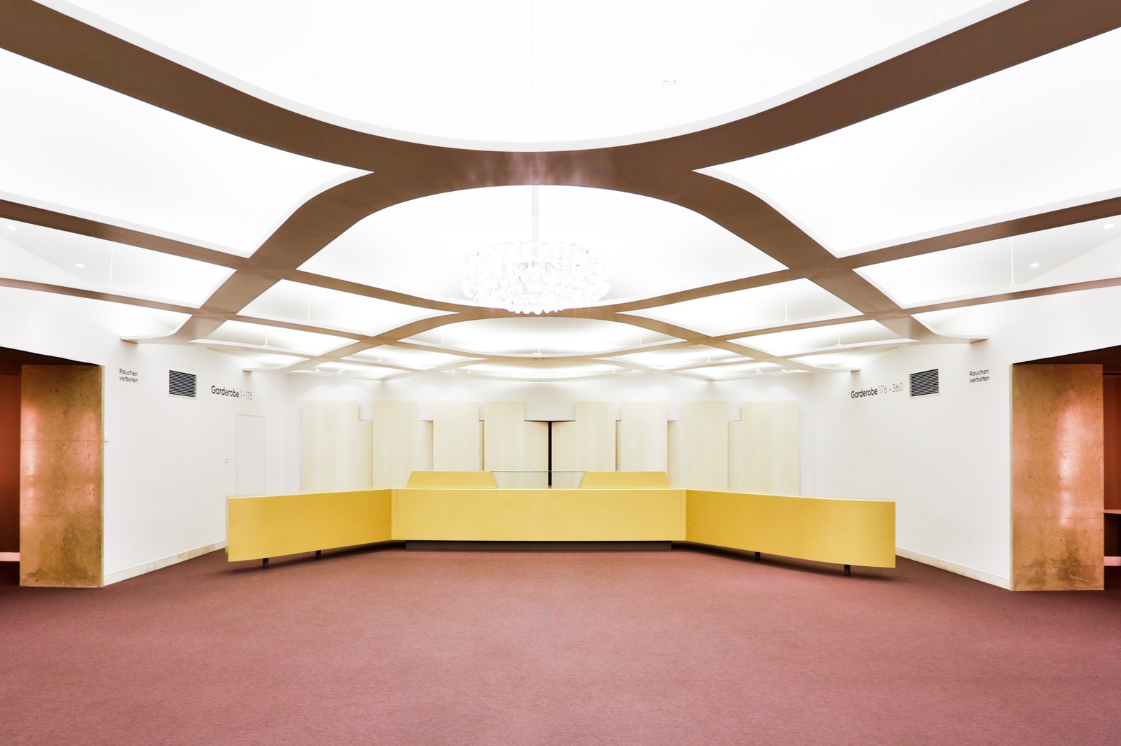 Umfassende Mauerdurchbrüche und die Verlegung der Abendkasse sowie der Garderobe erschließen neue Blickfelder und Publikums- wie Gastronomiebereiche mit Sitznischen. Die aufwendige Zwischendecke bringt Schwung und Struktur in das neue Foyer und setzt die ankommenden BesucherInnen in Szene.