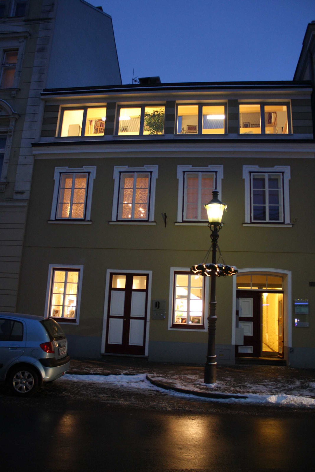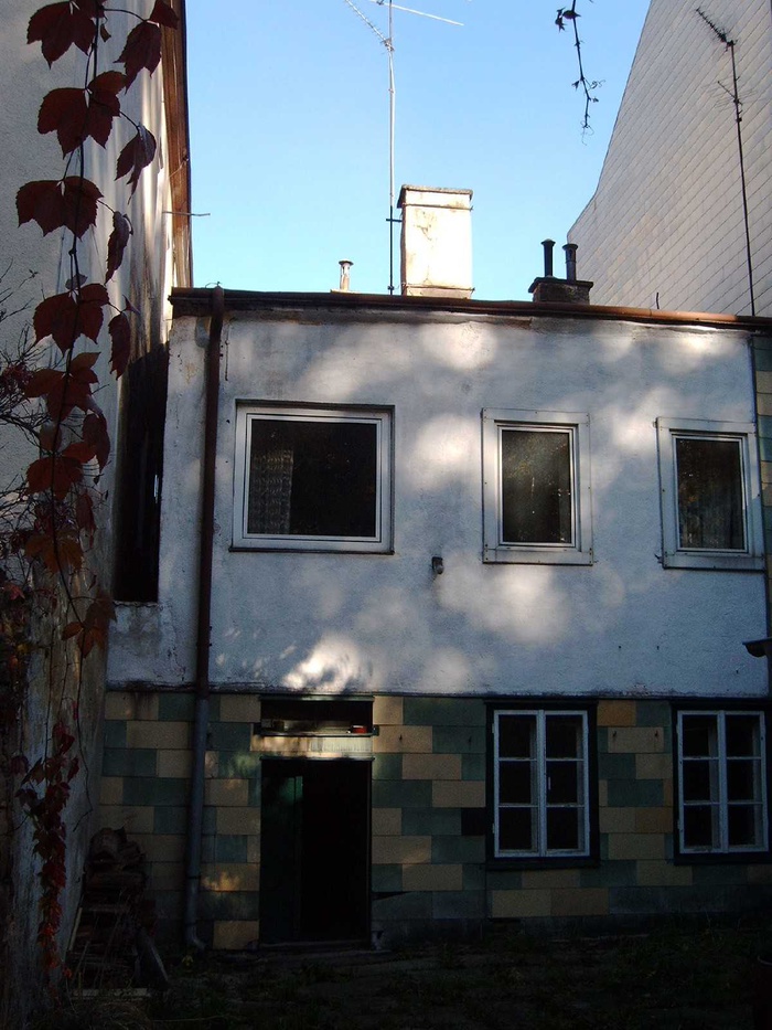 BesichtigungIm Jahr 2004 erwarben Irene Pelz und Franz R. Grossauer, die Architektin bzw. Landschaftsarchitekt sind, ein stark renovierungsbedürftiges Haus am Stadtplatz in Gmünd im innerstädtsichen Kerngebiet in geschlossener Bebauung. Laut der Gmünder Stadtchronik von Ignaz Pilz war das Gebäude erstmals im Herrschaftsurbar von 1569 als „halbes Haus“ eingetragen. Seither hatte es wechselnde Besitzer mit verschiedenen Gewerbebetrieben. Der platzseitige Teil des Gebäudes stammt aus dem Jahr 1877, der Kern des Gebäudes dürfte mindestens 100 Jahre älter sein. Sowohl das Geschäftslokal (seit 1976) als auch der Wohnbereich (seit 1996) waren zum Kaufzeitpunkt leerstehend. Die neuen EigentümerInnen planten für das Gebäude neben der privaten Wohnnutzung auch die Einrichtung eines Ateliers und die Reaktivierung des Geschäftslokals.