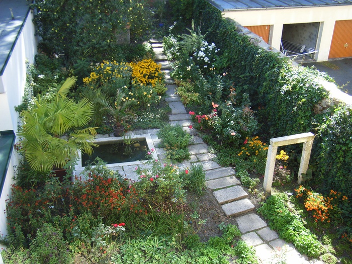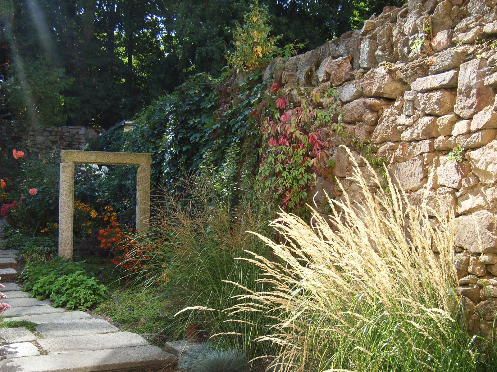 Am südlichen Ende grenzt der Garten an die historische Stadtmauer und den ehemaligen Schlosspark von Gmünd mit seinem alten Baumbestand, der einen Teil des Gartens stark beschattet. Bei der Neugestaltung des Gartens galt es, die ungewöhnliche Form des Grundstückes und die schwierigen Lichtbedingungen zu berücksichtigen. Man entschied sich für eine Querteilung in fünf Bereiche, denen verschiedene Elemente und Farben zugewiesen wurden.