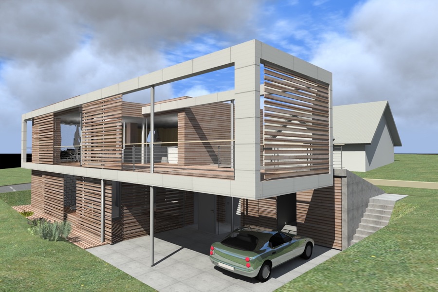 Das Passivhaus mit kompaktem Grundriss in zwei Geschossen erweitert sich in allen Bereichen fast nahtlos in den Außenbereich. Carport, Terrasse und überdachter Eingangsbereich werden mit flexiblen Sonnenschutzelementen kombiniert. Das Gebäude ist im leichten Hang eingebettet. Die Grasfläche im Norden überzieht das Nebengebäude und verbindet so das Obergeschoß mit dem Gartenbereich.