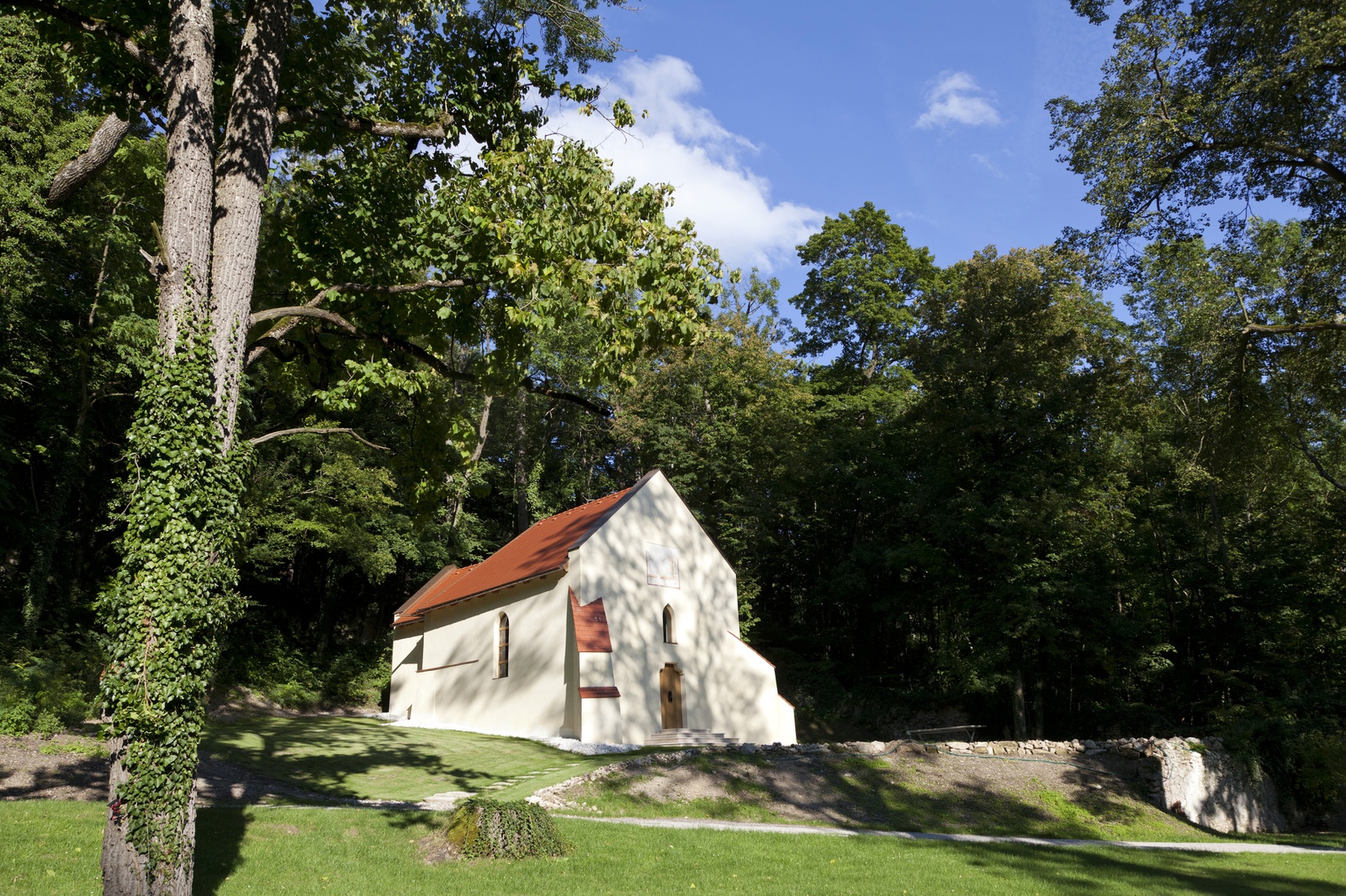 Auf dem Areal von Schloss Merkenstein befindet sich die Kapelle Merkenstein, ein ganz besonderes Kleinod inmitten eines weitläufigen Landschaftsgartens.
