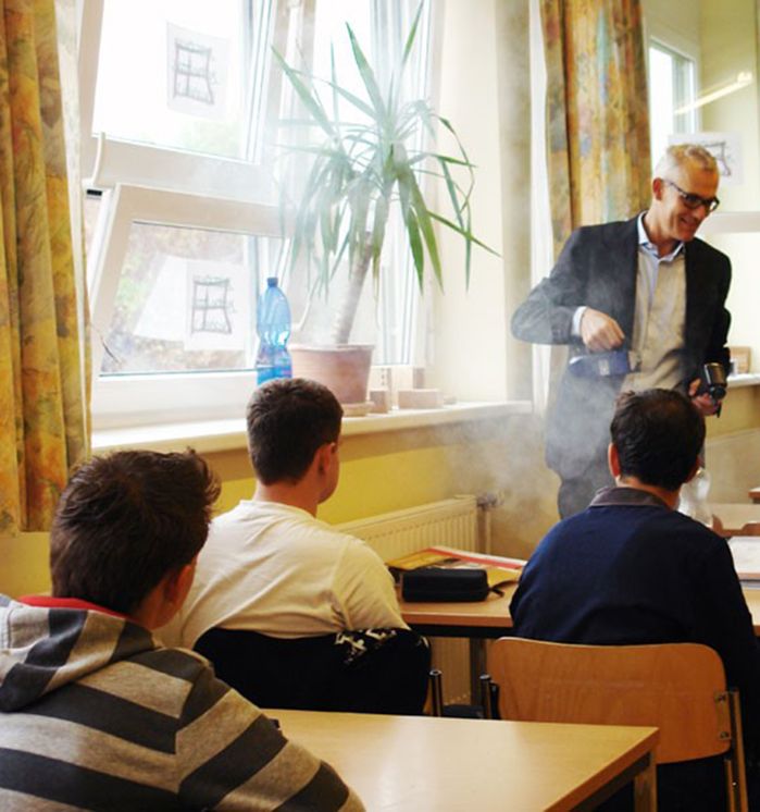 Daran schließen erlebnisreiche, weil praxisbezogene Workshops an, die zeitlich hintereinander für mehrere einzelne Klassen durchgeführt werden können (ca. 50 Min).
