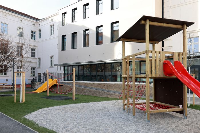 Folgende für eine moderne Schule zusätzlich notwendige Räume wurden in einem neuen Zubau im Schulhof untergebracht: