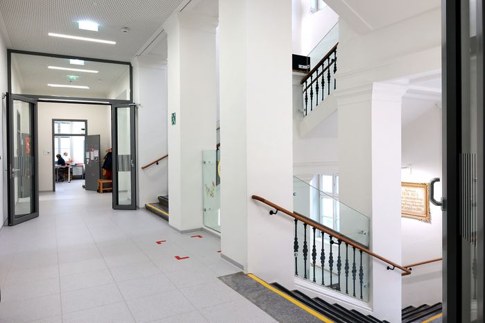 Das Gebäude wurde 1874 als Knabenvolkschule erbaut und steht unter Denkmalschutz. Zuletzt 1974 innen renoviert, waren sämtliche Oberflächen und die Haustechnik zu erneuern sowie die stark schwingenden Decken zu verstärken.